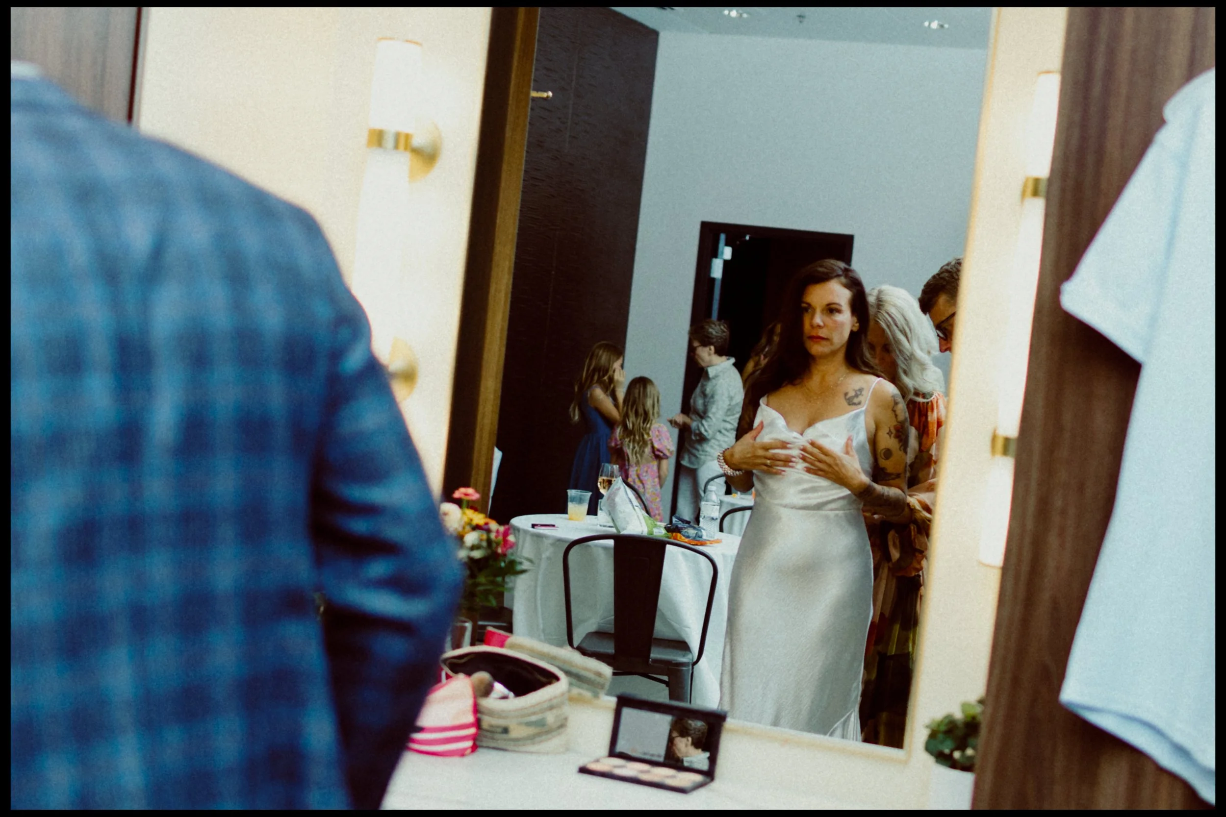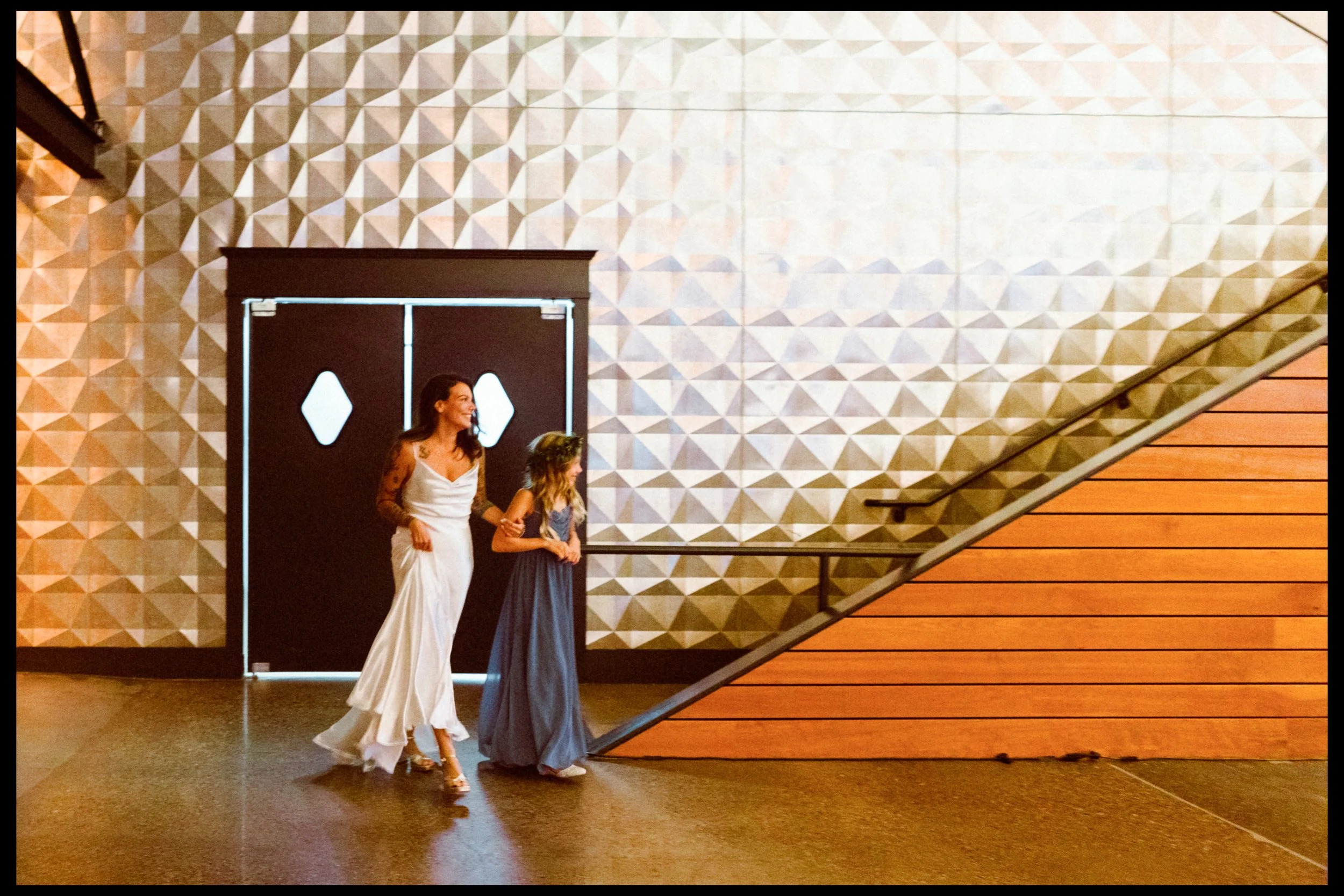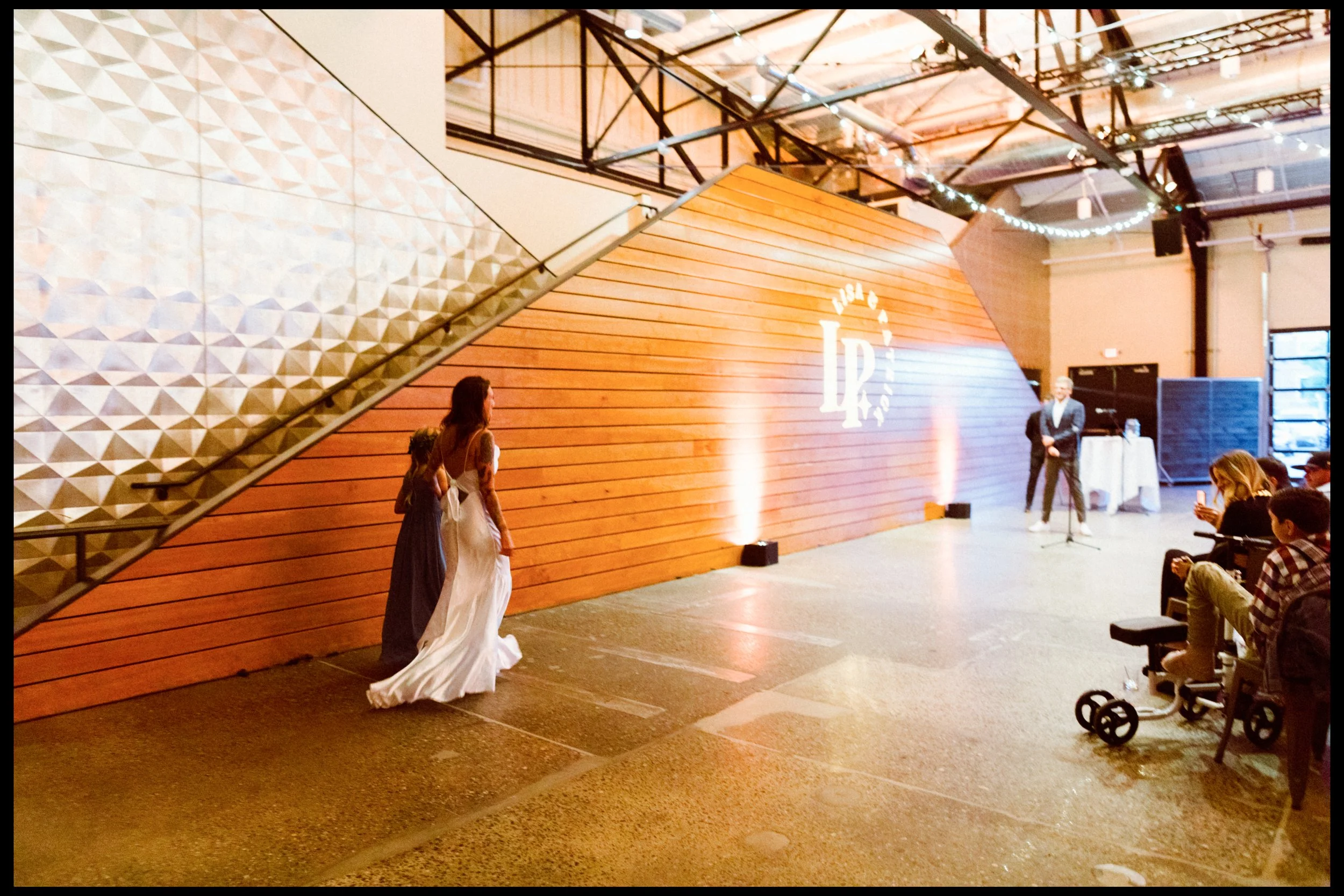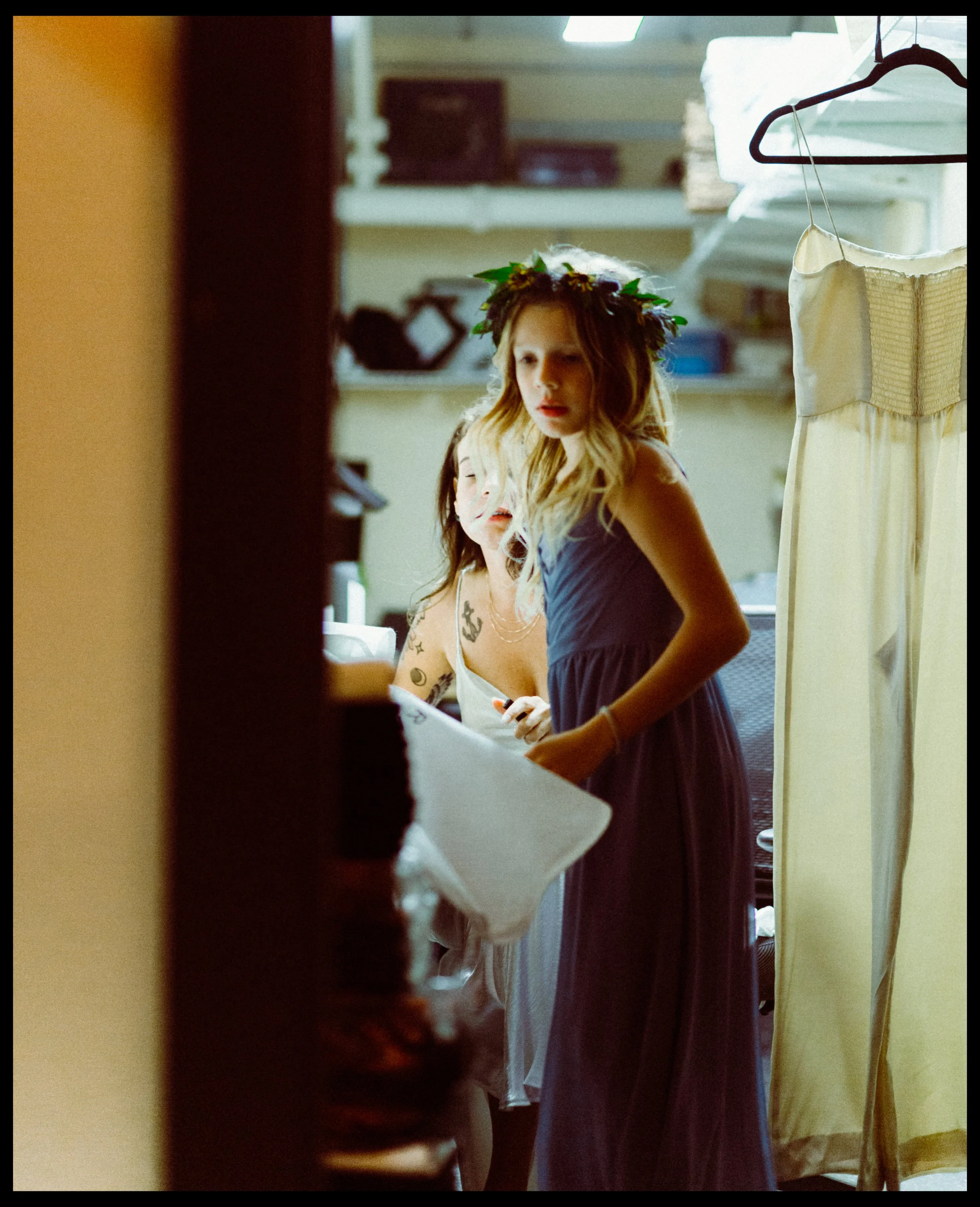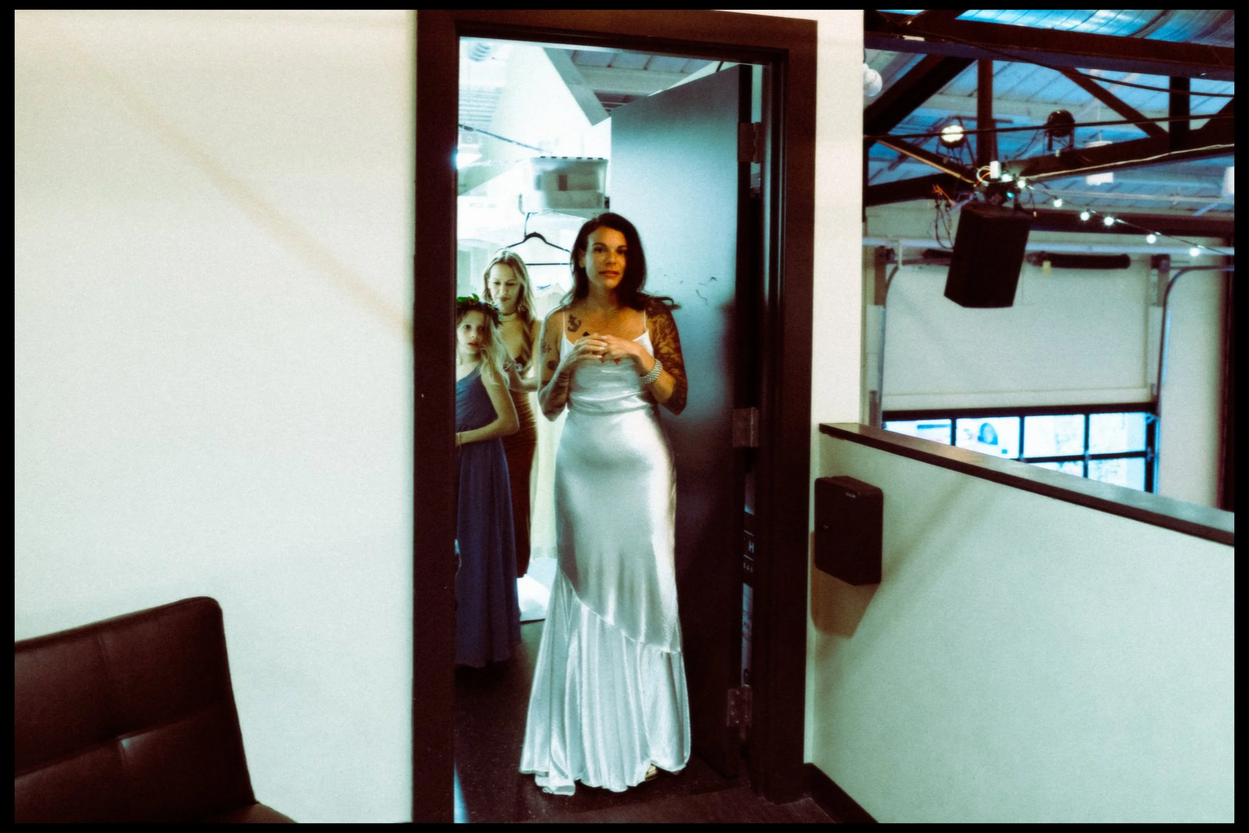 We moved over to Quincy Hall where Lisa’s friends helped her into her dress. Tucked away in the managers office, a quiet space; sharing laughter echoed through the walls as zippers zipped and final touches were made. Just outside the door, Penelope waited with excitement, ready to walk down with her mom. There was no pomp, no fanfare, just a warm, sacred pause before the vows. A moment suspended in time before everything changed.